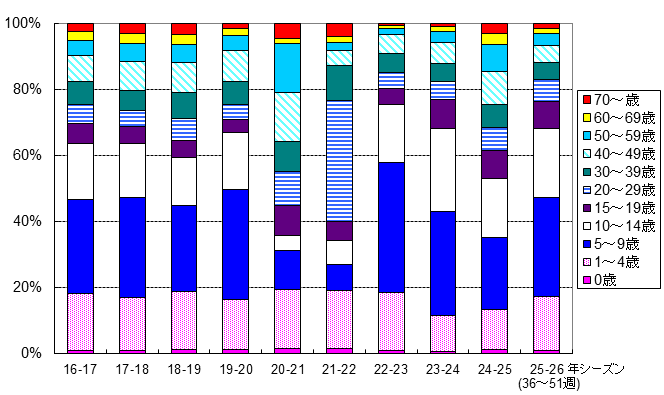 下図は最近10年間のインフルエンザ罹患者を年齢別に見たものです。