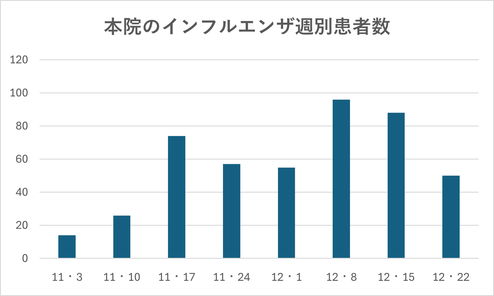 上図は、本院での今シーズンのインフルエンザ週別患者数です。12月8日の週が96人とピークでした。全国のデーターでは11月17日の週がピークで、定点当たり60となっています。インフルエンザの流行は地域差が多くこのようなずれが生じます。また本院のグラフは上がったり下がったりが見られますが、これは対象となる患者さんが小さいために起こります。全国の統計では、徐々に増加し、徐々に低下する滑らかな曲線になります。